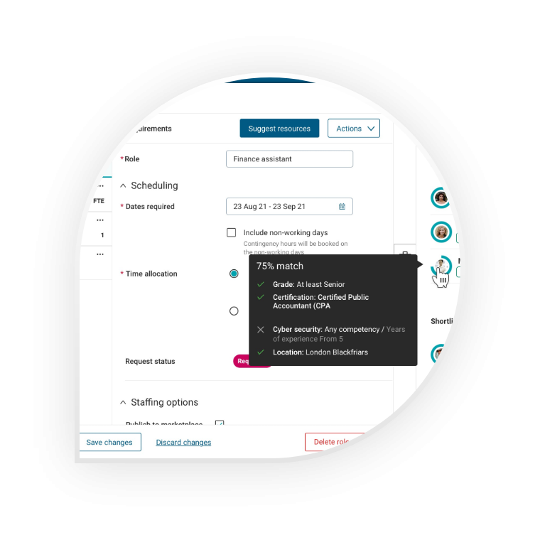 Quickly fill job requests with our AI suitability matching, which learns from experience and matches relevant skills to suggest the best resource with explainable results.